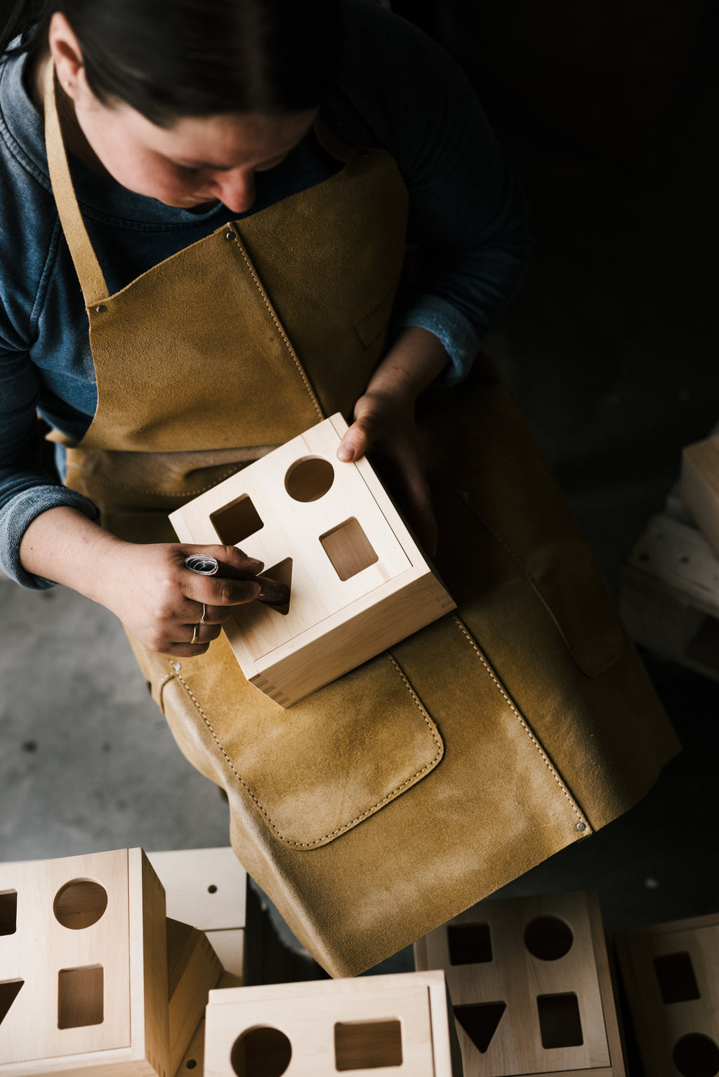 Each piece is handcrafted in Poland from FSC®-certified wood and finished with beeswax and botanical oils, creating a smooth, safe surface for little hands. Naturally coloured with eco-friendly paints, the vibrant geometric shapes encourage sorting, stacking, and imaginative interaction.